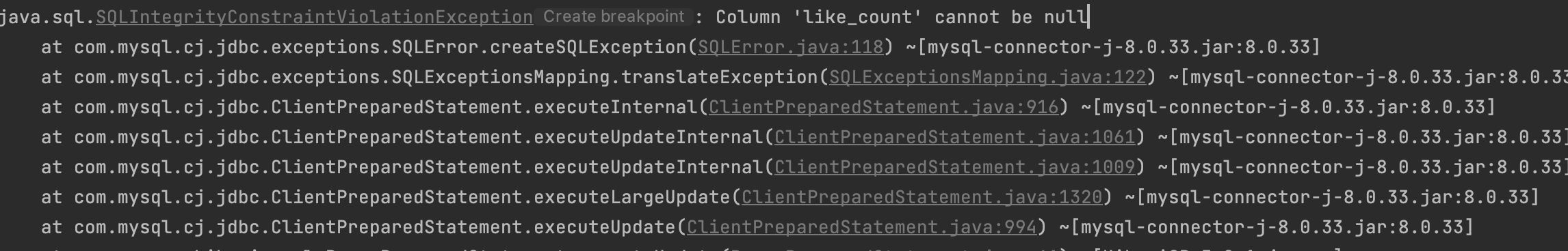 Post 클래스에 @DynamicInsert, @DynamicUpdate를 달고 likeCount에 @ColumnDefault("0")을 달았더니 해결됐다.
